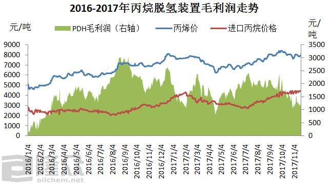 由上圖可見,2016-2017年丙烷脫氫毛利潤表現(xiàn)樂觀,裝置均無虧損情況,尤其在夏季,受原料氣丙烷價格低位,使丙烷脫氫裝置獲利更為理想。華南地區(qū)是國內(nèi)進口氣集中地,而丙烷脫氫裝置,工藝來源于國外,原料氣丙烷也基本依賴進口,裝置在華南投產(chǎn)建設,原料提供方便。目前,華南地區(qū)的進口丙烷資源多作為工業(yè)氣或者搭配丁烷或者搭配當?shù)責拸S氣今日民用市場,均是作為提供熱值的燃料,據(jù)隆眾數(shù)據(jù)監(jiān)控,2016年華南進口毛利潤在257元/噸左右,2017年至今進口毛利潤在194元/噸左右,相比丙烷脫氫裝置利潤優(yōu)勢十分明顯。