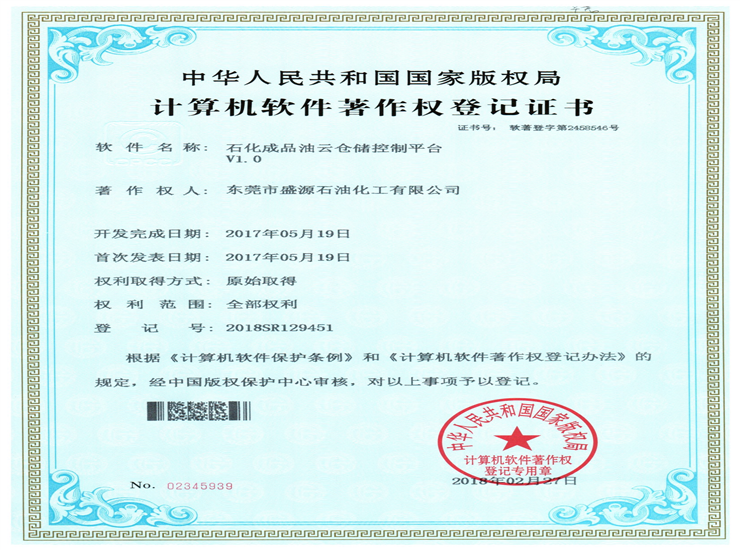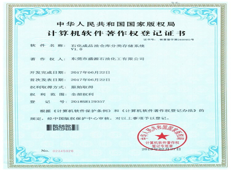 石化成品油分類存儲系統著作權登記證書Click for larger image