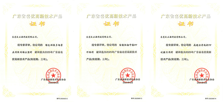 近日,廣東省高新技術企業(yè)協(xié)會公布了2025年第一批廣東省名優(yōu)高新技術產(chǎn)品名單。東莞巨正源科技有限公司的“綠色環(huán)保多場景應用聚丙烯注塑料”、“紡能恒韌中熔PP纖維料”、“高透潔凈低析PP吹膜專用料”三項產(chǎn)品憑借卓越的產(chǎn)品品質(zhì)、創(chuàng)新的產(chǎn)品技術和領先的市場地位,榮獲“廣東省名優(yōu)高新技術產(chǎn)品”稱號。
